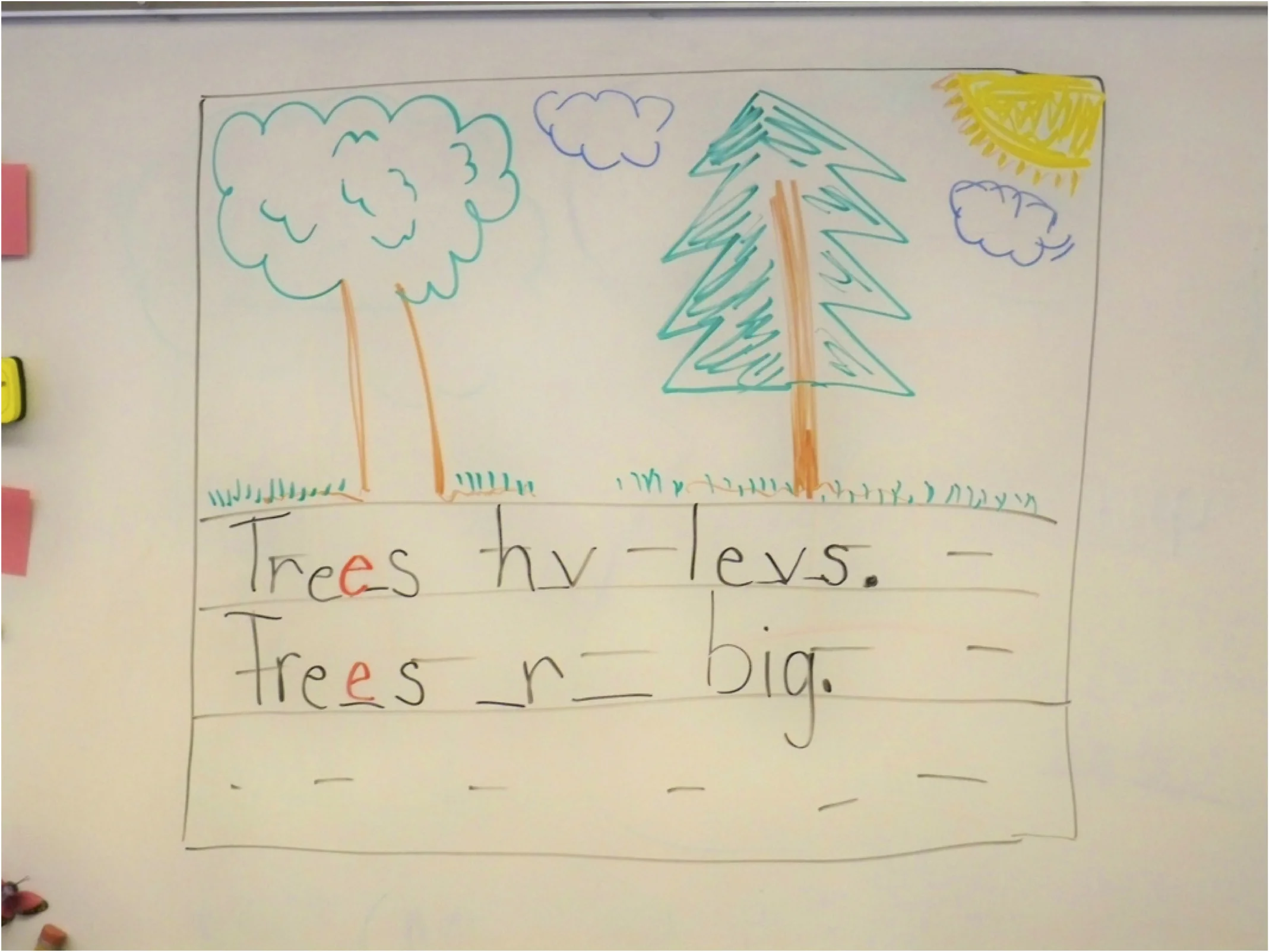In the picture of a teacher’s model of invented spelling, notice that blanks are incorporated to encourage students to think about what letters could possibly be a part of the words. In addition, the second ‘e’ in “tree” was written in red to highlight to students it is not a sound they will hear, but rather, a spelling pattern they are learning and can try again in the future when they hear the long e sound in a word.