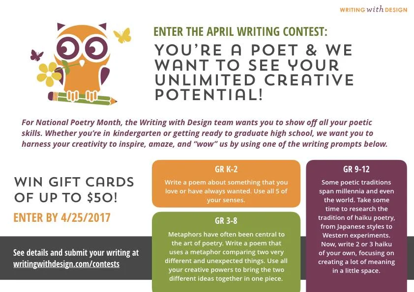 On that note, it's time to introduce your April writing contest! With National Poetry Month this month, we knew we had to get you some writing prompts that would show off your students' creative, poetic skills. Grab a prompt for your class & get those entries in by the 24th!